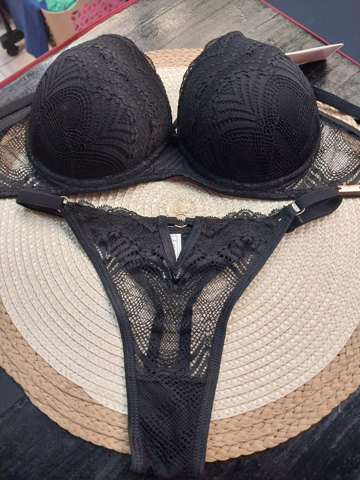 CONJUNTO DE ENCAJE CON ARO Y RELLENO, CON DETALLE DE TIRITA CRUZADA EN EL BUSTO. CON COLALESS REGULABLE
